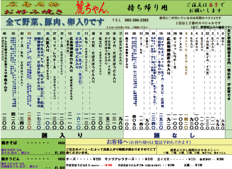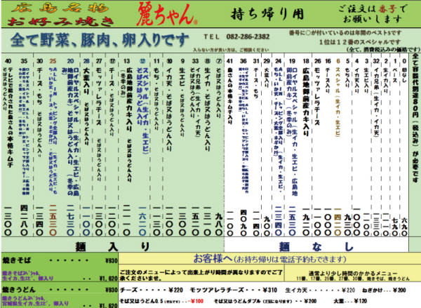 11番、17番、25番、27番、30番、焼きそば、焼きうどん